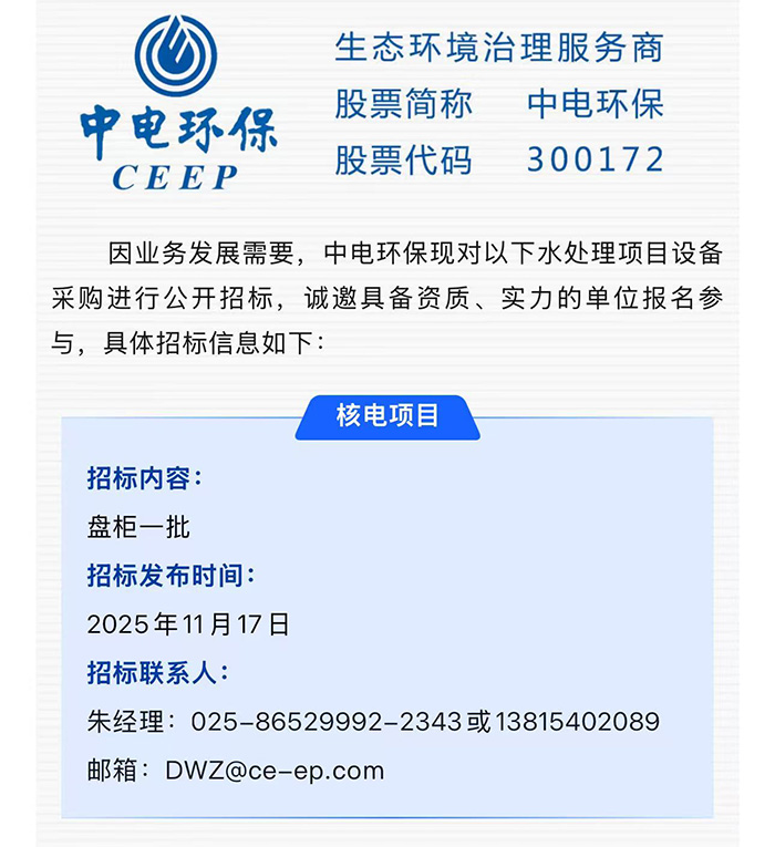 中電環(huán)保股份有限公司是南京市首家環(huán)保上市公司(股票簡稱:中電環(huán)保,股票代碼:300172),南京環(huán)保產業(yè)協(xié)會會長單位,國家級聯盟理事長單位,是生態(tài)環(huán)境治理服務商,主營(3+1):水務、固危廢、煙氣治理及產業(yè)創(chuàng)新平臺,包括:工業(yè)水處理、污水處理及水環(huán)境綜合治理;固危廢土壤、污泥餐廚垃圾處理;煙氣及VOCS治理;智慧環(huán)保;高端裝備等。